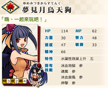 ※「夢見月烏天狗」和一般的烏天狗相比,除了能力值相當於稀有式姬外,固有技能也不相同。
