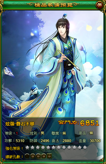 | 累計儲值≥10000元寶 | 高級強化暴擊石*5、八星強化保護符*5、九星強化保護符*5、隨機家法箱*1、星移符*1、鎏金炫彩線*1、澄色家丁卡*1 |