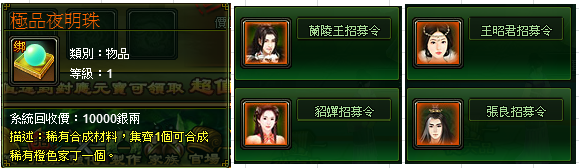 | 累計儲值≥80000元寶 | 五級寶石袋*10、初級聚靈丹*200、繼承丹*1、極品夜明珠*1(可兌換橙色家丁固定成長值100,非常稀有,無法通過家丁卡刷出) |
