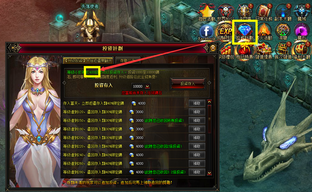 7. 投資計畫調整為,玩家等級400級以下皆可參加