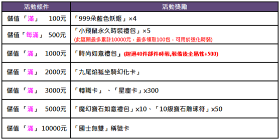 活動期間內,單日累積儲值金額達以下條件,即可獲得符合資格的所有獎勵。