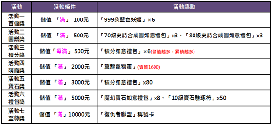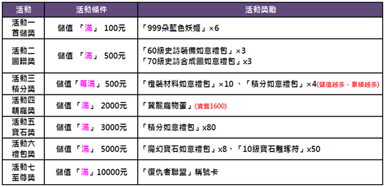 活動期間內,單日累積儲值金額達以下條件,即可獲得符合資格的所有獎勵。