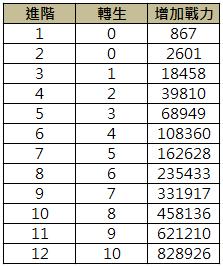 增加戰力可參照下表,以下數據不包含任何坐騎等級增加的額外素質。