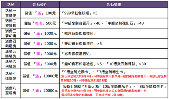 #上述坐騎進階卡及轉生卡兌換,玩家在儲值後於06/08(一)12:00前需至客服中心申請。