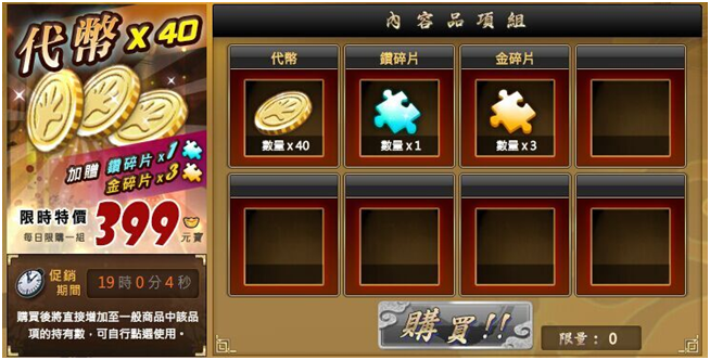 為感謝眾多玩家的熱情支持,官方加碼推出阿達力代幣促銷包!只要399元寶就可購入阿達力代幣促銷包,讓所有君主都能買到賺到,維護前限時特賣,每人每日限購1組,市集於00:00刷新,限定特惠價,要買要快!!