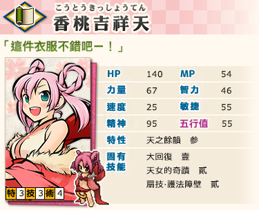※香桃吉祥天的能力等同於稀有式姬,和一般的吉祥天相比,技、術的欄位和固有技能不同,也能裝備輕鎧系裝備。