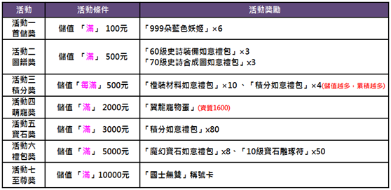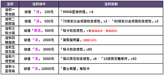 活動期間內,單日累積儲值金額達以下條件,即可獲得符合資格的所有獎勵。