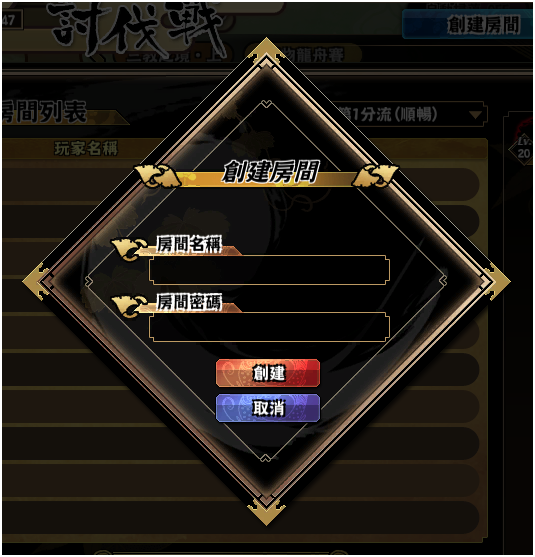 選擇創建房間,玩家可以自訂房間名稱及房間密碼,邀請好友一起進行活動。