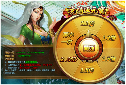 【活動說明】:在活動期間,玩家每天都可以在遊戲中進行輪盤,轉到多少,就可以獲得多少的元寶返還,最高可以有2.0倍的元寶返還喔!