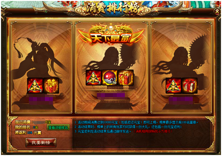 【活動說明】:活動期間內消費達10000元寶(包括返還元寶)即可上榜,榜單最多顯示前100名富豪,活動結束時,榜單上的所有玩家均可獲得豪禮(消耗相同按照戰鬥力排行)