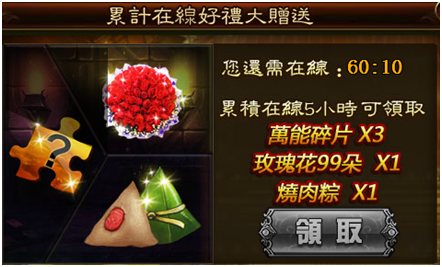 | 5小時 | 萬能碎片*3、玫瑰花99朵*1、燒肉粽*5 |