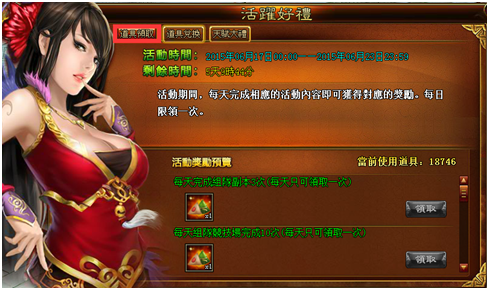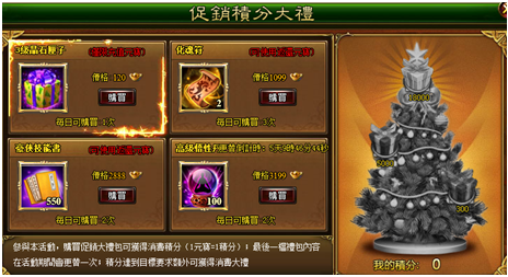 【活動說明】:活動期間內,購買促銷大禮包可獲得消費積點(1元寶=1積分),積分達到目標要求額外可獲得消費大禮。