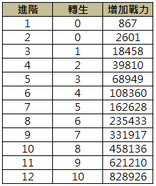 增加戰力可參照下表,以下數據不包含任何坐騎等級增加的額外素質。