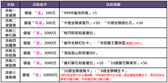活動期間內,單日儲值累積金額達以下條件,可獲得符合資格的獎勵: