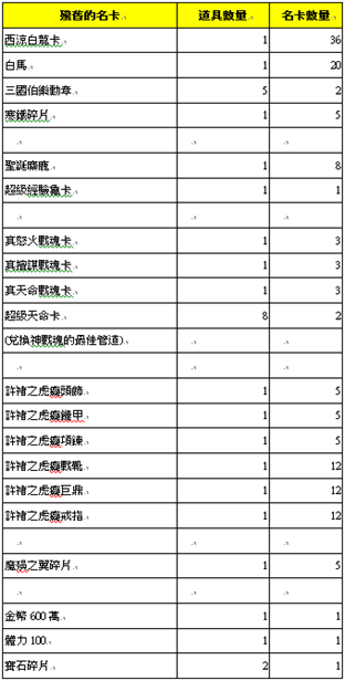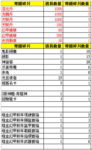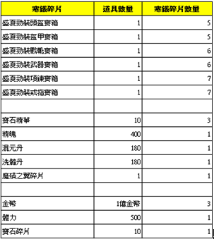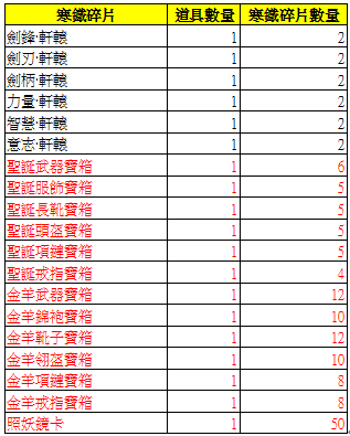 【活動內容】:使用寒鐵碎片,殘舊的名卡可於神器祭壇兌換以下的獎勵。