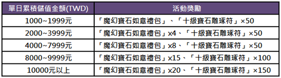 活動期間內,單日累積儲值金額達以下條件,即可獲得符合資格的所有獎勵。