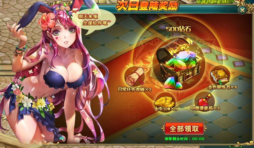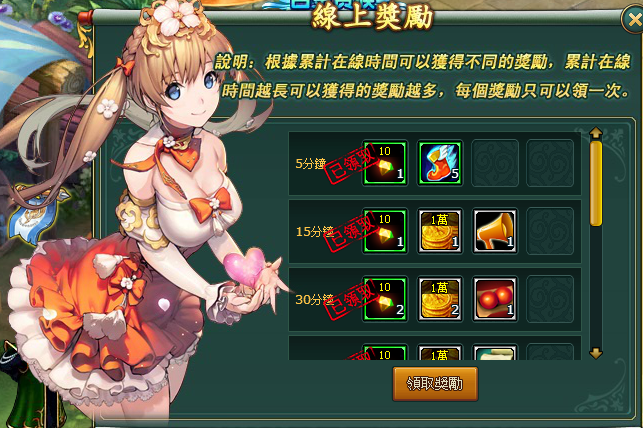 線上30分鐘:20鑽石、1萬金幣*2、低級潛能藥*1
