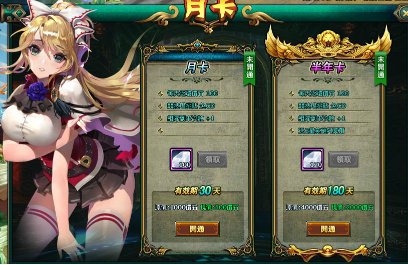 半年卡特權:每天返還鑽石100、競技場挑戰免CD、組隊副本次數+1、2星英雄阿莫爾*1