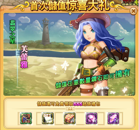活動內容:玩家在伺服器第一次儲值將獲取豐厚的獎勵,其中包括2星英雄等。