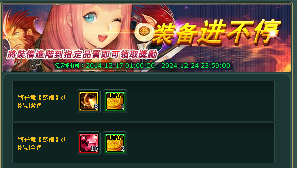 任意裝備進階到紫色:裝備進階石(金)*8,金幣10W