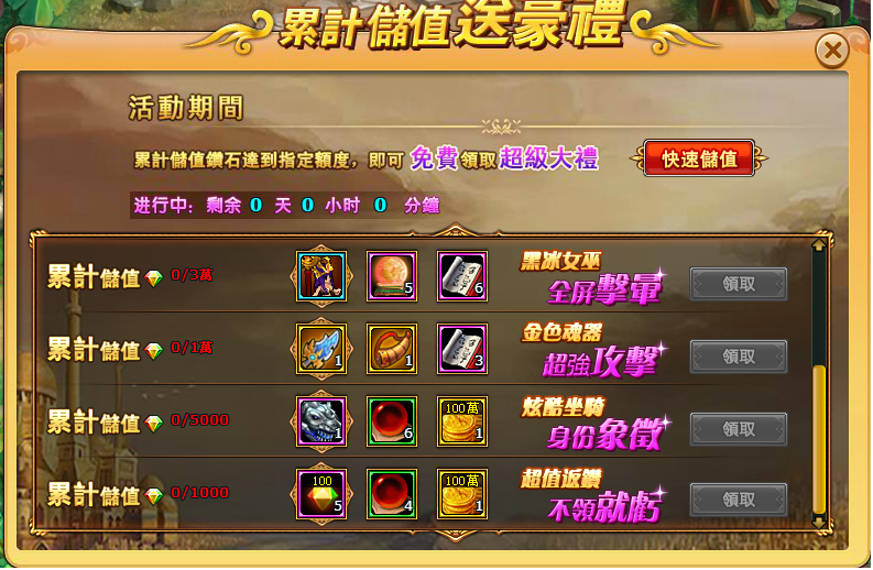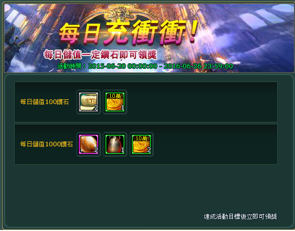 活動內容:每日儲值一定鑽石即可領獎。