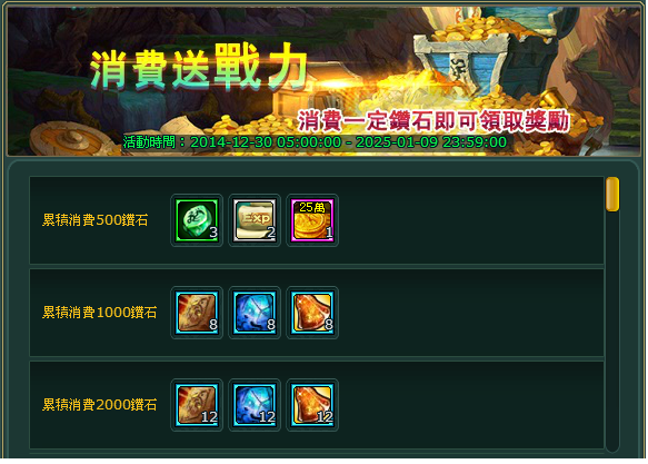 累計消耗達到500鑽石:英雄進階石(綠)*3、雙倍經驗卷*2、金幣25萬