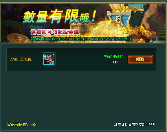活動內容:人物等級達到43級獲得超級英雄,數量有限達標即可領取。