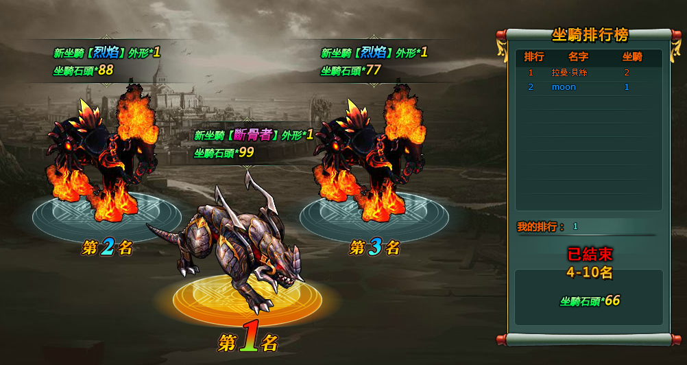 第二名:新坐騎【烈焰】外形*1、坐騎石*88