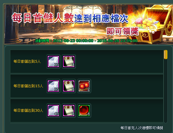 活動內容:每日首儲人數達到相應檔次即可領獎。