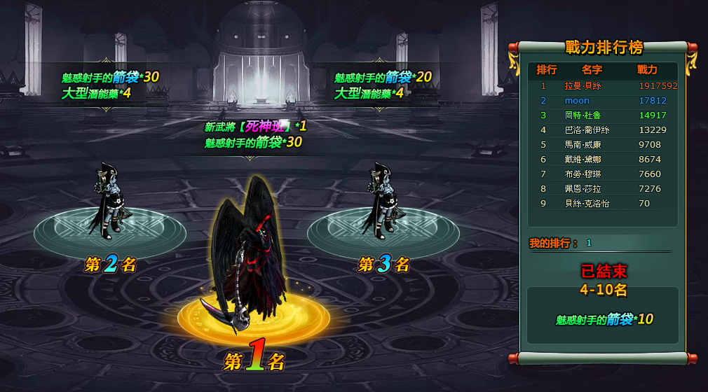 活動內容:在活動截止時玩家戰力排行榜前十名將獲得豐厚獎勵