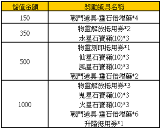3.如玩家於活動期間單筆儲值金額1000,共儲值2次,則活動結束後可領到單筆儲值1000獎勵2份,以及累計儲值2000獎勵乙份,依此類推。