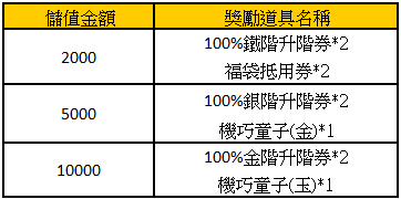 例二:小張活動期間共儲值12,000,則可獲得所有獎勵各乙份,以及2000獎勵乙份。