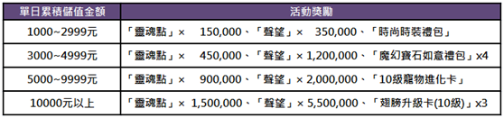 活動期間內,單日累積儲值金額達以下條件,即可獲得符合資格的區間獎勵。