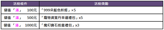 範例:小飛鼠於07/19(日)儲值3000元,即可獲得「999朵藍色妖姬」x5、「寵物資質丹幸運禮包」x5、「魔幻寶石如意禮包」x7、「靈魂點」x450,000、「聲望」x1,200,000與0718【史詩裝備の煉製】活動獎勵。