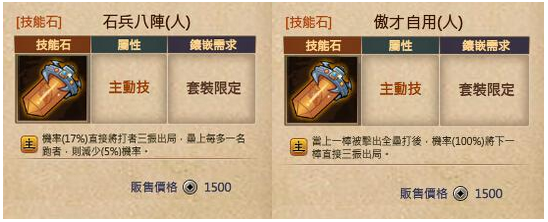 球場也可獲得技能石囉!現正舉辦機率掉落「技能石」活動,讓所有玩家可以快速替換技能提昇武將價值,可針對自身需求進攻州郡球場,若攻打成功則有機率獲得技能石,除了青州球場 - 石兵八陣技能石(人),兗州球場 - 傲才自用技能石(人),也有機會獲得其它技能石,且當日攻打越多次球場則獲得技能石的機率也會進而提升哦!