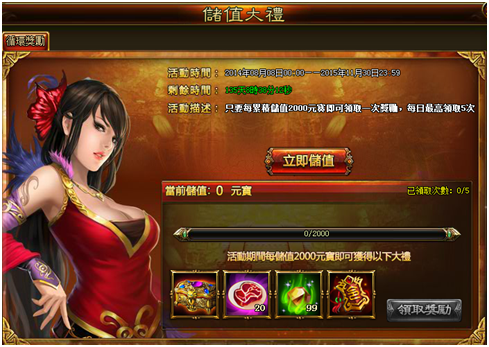 【活動說明】:每累計儲值2000元寶即可領取一次獎勵,每日最高領取5次。