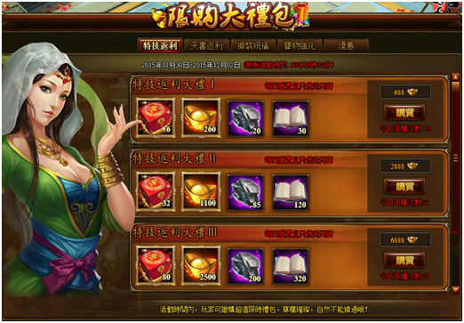 【活動說明】:活動期間內,玩家可搶購超值限時禮包,寶藏璀璨,要買要快!!。