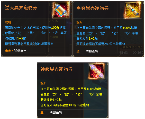| 3000 | 紋章境界丸*150、寵物潛能卷軸*50、優秀異界寵物卷*3 光環:六芒星光*1(7日) |