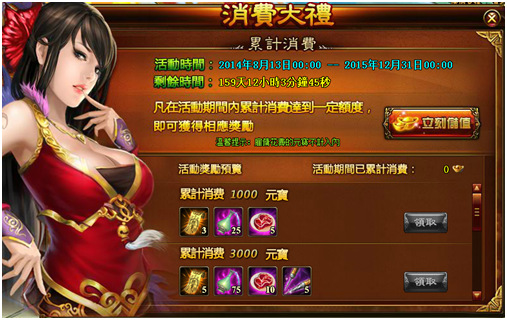 【活動說明】:凡在活動期間內每日累計消費達到一定額度,即可獲得相應獎勵(雇傭花費的元寶不列入計算)。
