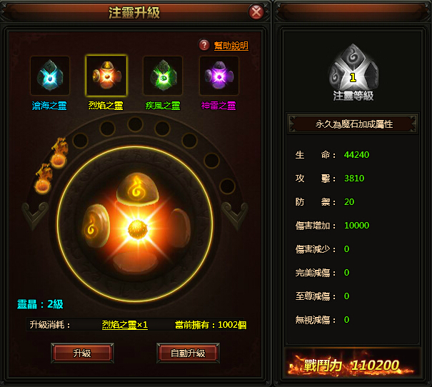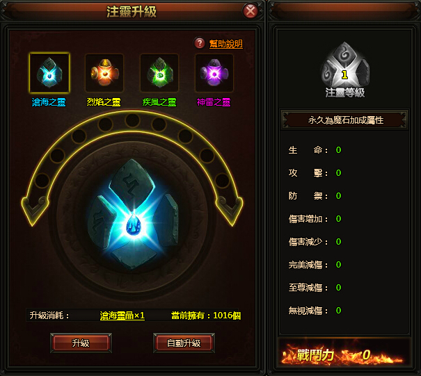 ※注靈升級共分為滄海、烈焰、疾風、神雷四種,而滄海和疾風主要是攻擊增傷屬性,而烈焰與神雷為防禦減傷屬性,可升級部分則分為「靈晶升級」與「靈源升級」。