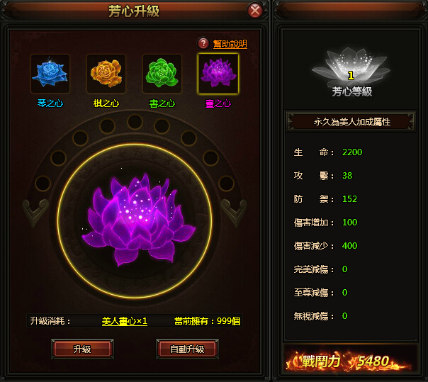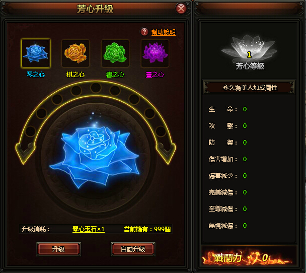 ※芳心共分為琴、棋、書、畫四種,而琴和書主要是攻擊增傷屬性,而棋與畫為防禦減傷屬性,可升級部分則分為「靈晶升級」與「靈源升級」。