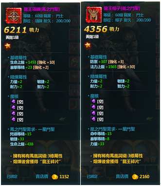 龍王裝備60級即可裝備,獲取就擁有三條屬性詞綴,隨機為「鳳」、「凰」。
