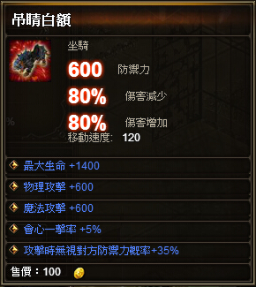防護值+500 生命+100 攻擊力+5% 魔法攻擊力+5% 卓越一擊傷害+10%