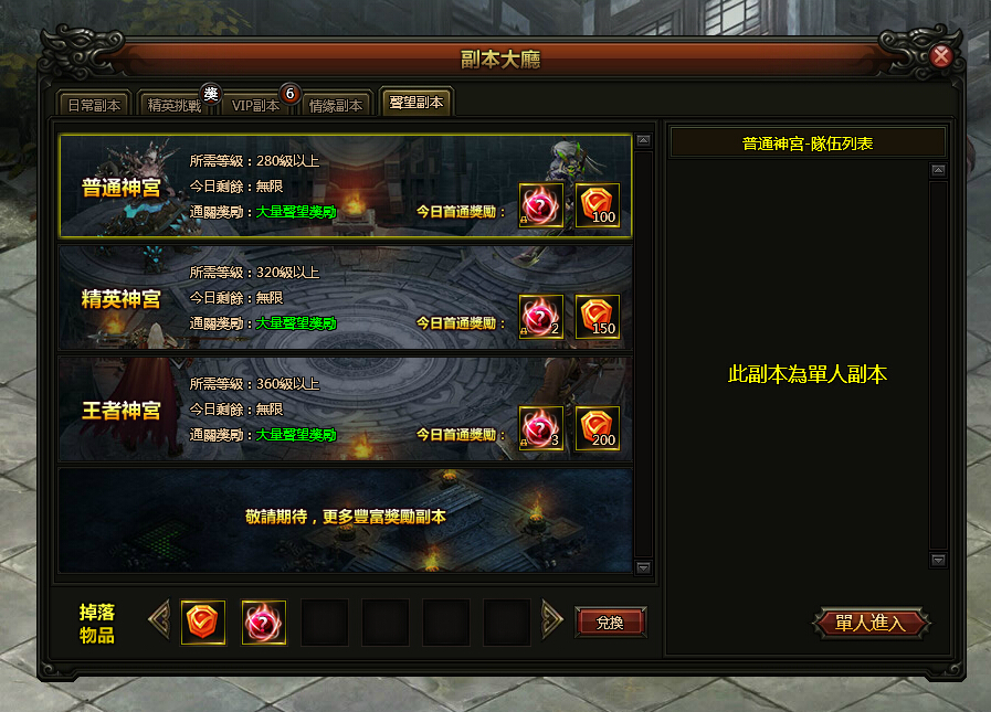 3個聲望副本每日都不限制進入次數。