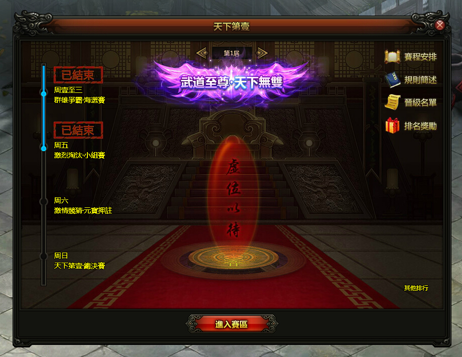 (1) 開服三天或以上的服才能參加天下第一爭霸賽,參與玩家需要達到250級,戰力超過150000。