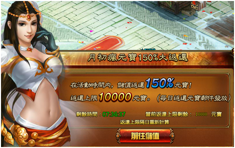 【活動說明】:於活動時間內儲值元寶返還150%,機會難得要儲要快!