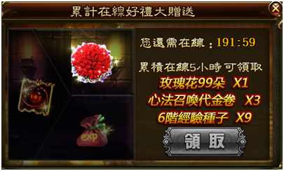 | 滿5小時 | 玫瑰花99朵*1、心法招喚代金卷*3、6階經驗種子*9 |