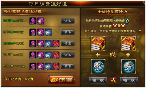 【活動說明】:凡在活動期間內每日累計消費達到一定額度,即可獲得相應獎勵,累計消費滿3000元寶加送七級技能書&坐騎攻擊加成丹喔!(雇傭花費的元寶不列入計算)。
