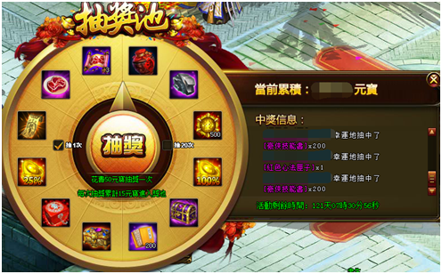 【活動說明】:活動期間內玩家可花費50元寶抽獎一次,每次抽獎累計15元寶進入獎池,玩家有機會抽中100%把獎池全部獎金帶走喲!
