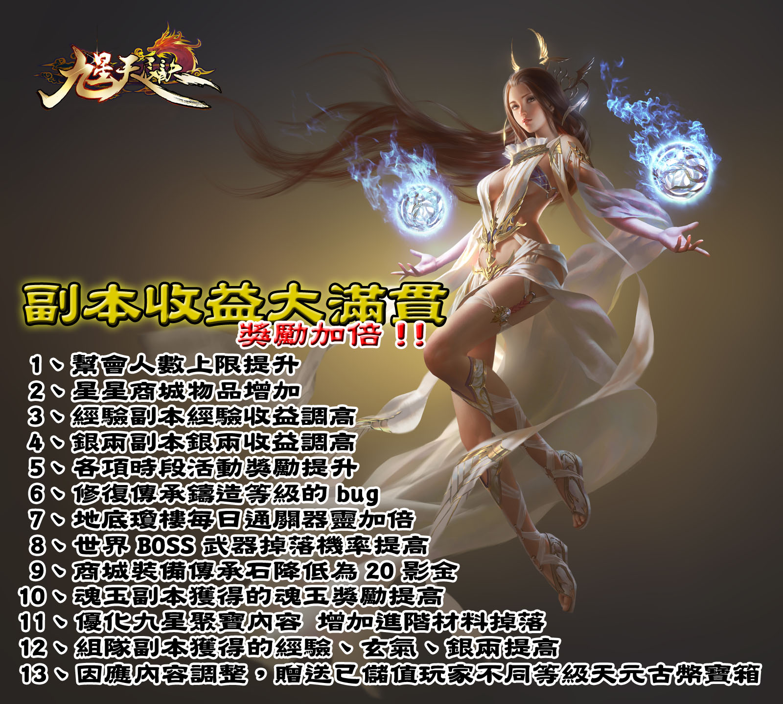 親愛的玩家您好: 九星天辰訣伺服器將於9/8 10:00進行伺服器維護更新,更新獎勵內容如下圖所示,預計更新時間2小時,請玩家於明日維護前做好離線準備,並留意官方網站最新消息。 維護時間:10:00~12:30(延長維護)-已開機 開機時間:12:30